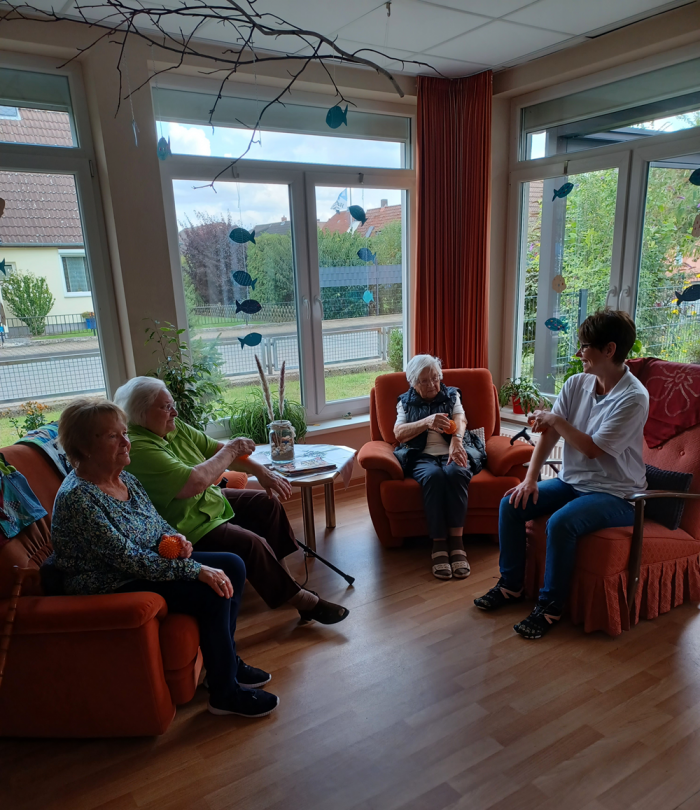 Bewegung hält fit: Sandra Kellner (r.) unterstützt die Bewohnerinnen des Pflegeheims u. a. mit Motorikübungen.